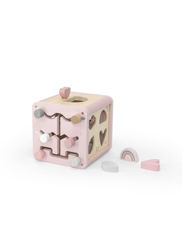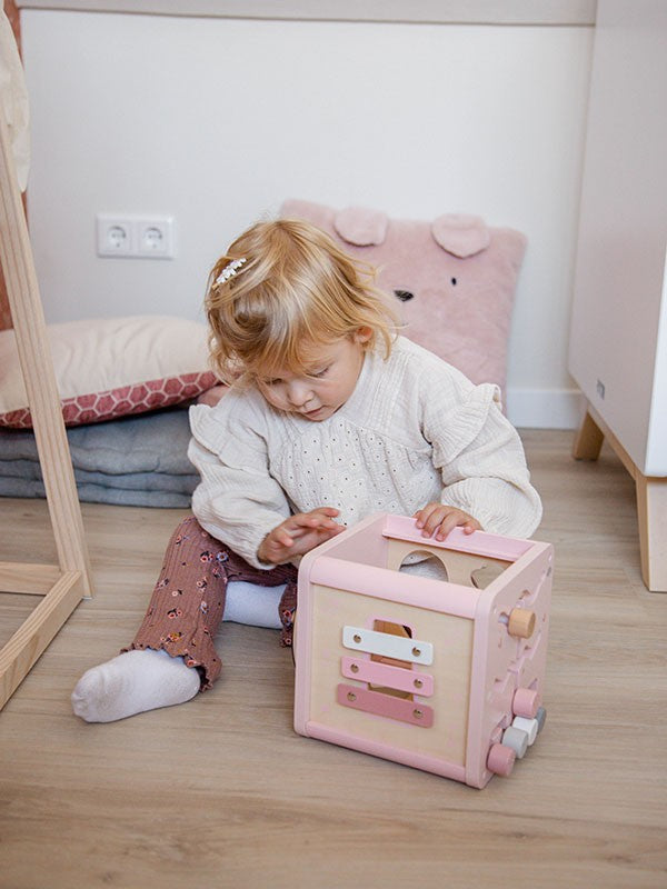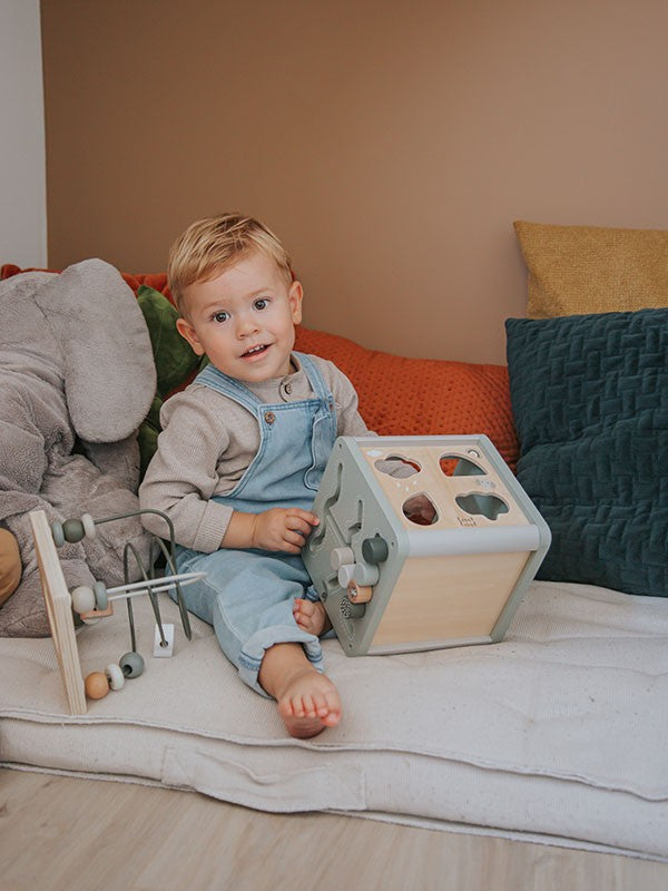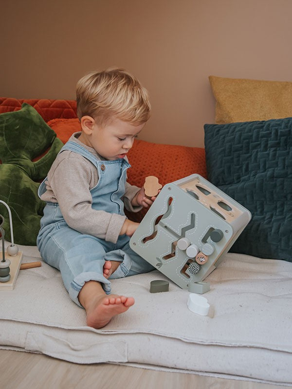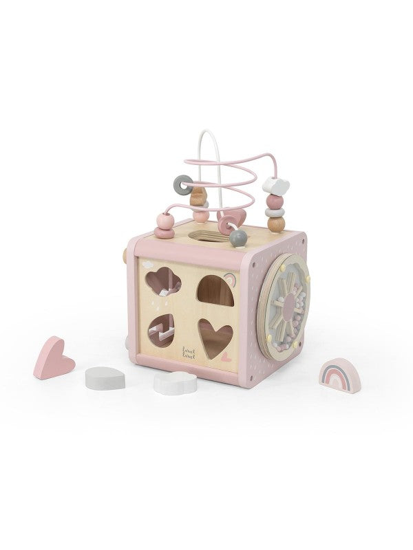 Der 5-in-1-Aktivitätswürfel enthält einen Formensortierer, Zahnräder, ein Schienenlabyrinth, ein Xylophon und ein Perlenlabyrinth, um Kinder zu beschäftigen. Das Perlenlabyrinth lässt sich vom Würfel abnehmen und bietet so zwei separate Spielzeuge. Das multifunktionale Spielzeug bietet faszinierende, kontinuierliche Bewegung für viel dynamischen Spaß, fördert Kreativität und logisches Denken, die Feinmotorik und die Entwicklung kognitiver Fähigkeiten wie Formen, Farben, Zählen und Assoziieren.