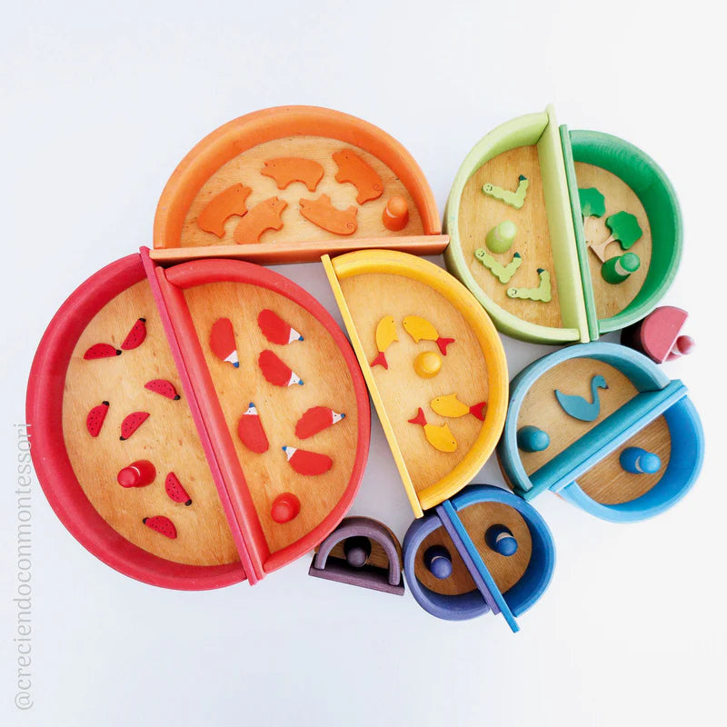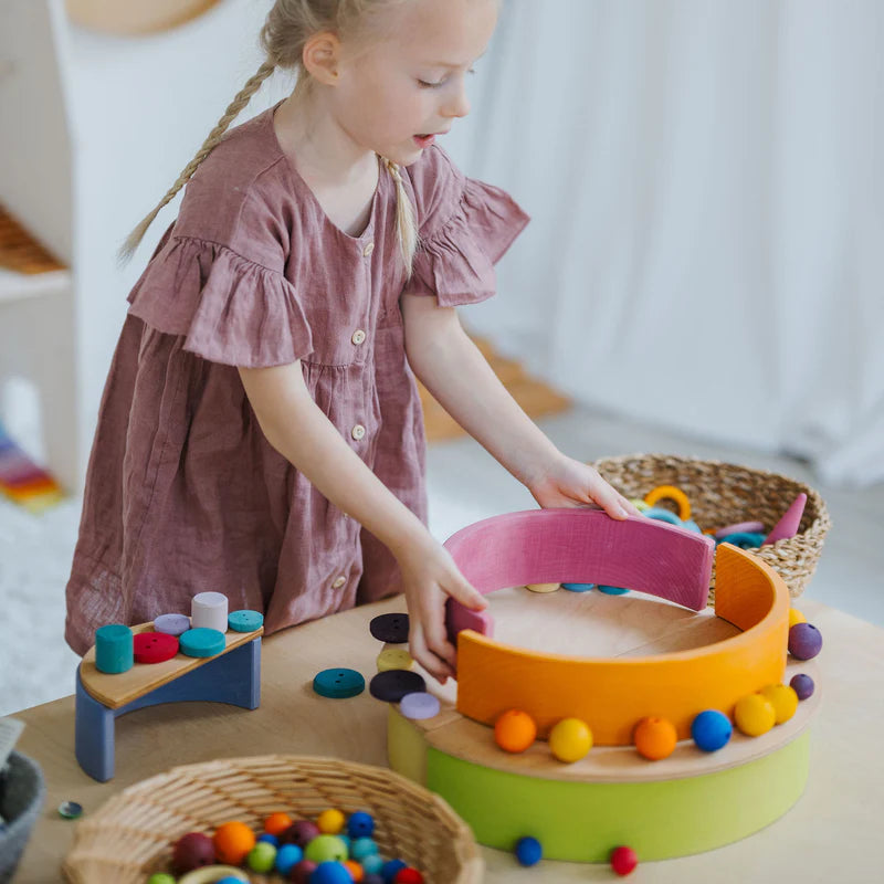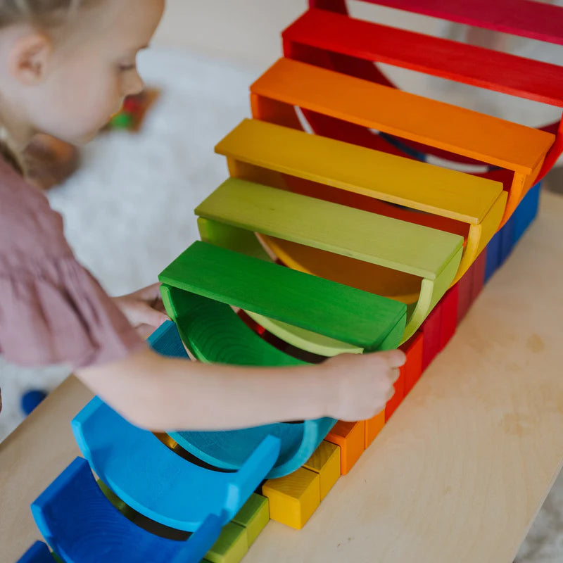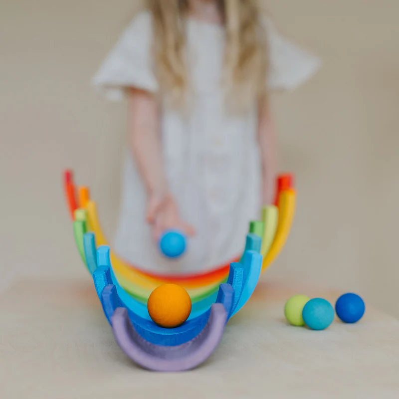Unser Großer Regenbogen ist ein wahres Multitalent. Klar sieht er im Regal toll aus, aber sein volles Potenzial kommt erst so richtig zum Vorschein, wenn man ihn in seine Einzelteile zer- und dann einfach mal loslegt. Er ist bereit zum Stapeln und Bauen sämtlicher Fantasielandschaften, Kreieren von kleinen Spielwelten, Erfinden von kinderleichten oder auch kniffligen Kugelbahnen, vielseitigen Einsatz in Rollenspielen, Legen lustiger Flatlays, Farben Kennenlernen und Sortieren und Energie Rauslassen beim aktiven Bewegungsspiel. Das klingt vielleicht nach Übertreibung, ist’s aber nicht – versprochen! ;) Elterntipp: Um das freie Spielen anzustupsen, empfehlen wir, nicht den aufgebauten Regenbogen zum Spielen hinzustellen, sondern die einzelnen Bögen wild in einen Korb kippen. So werden die Teile mehr als Baumaterial gesehen und das Bild des zusammengebauten Regenbogens behindert nicht die Fantasie für alle anderen Spiel- und Bau-Möglichkeiten damit. 12 Teile Materialien: Lindenholz, lasiert mit Farbe auf Wasserbasis Maße: Länge 35,5-36,5 cm, Höhe 17-18cm
