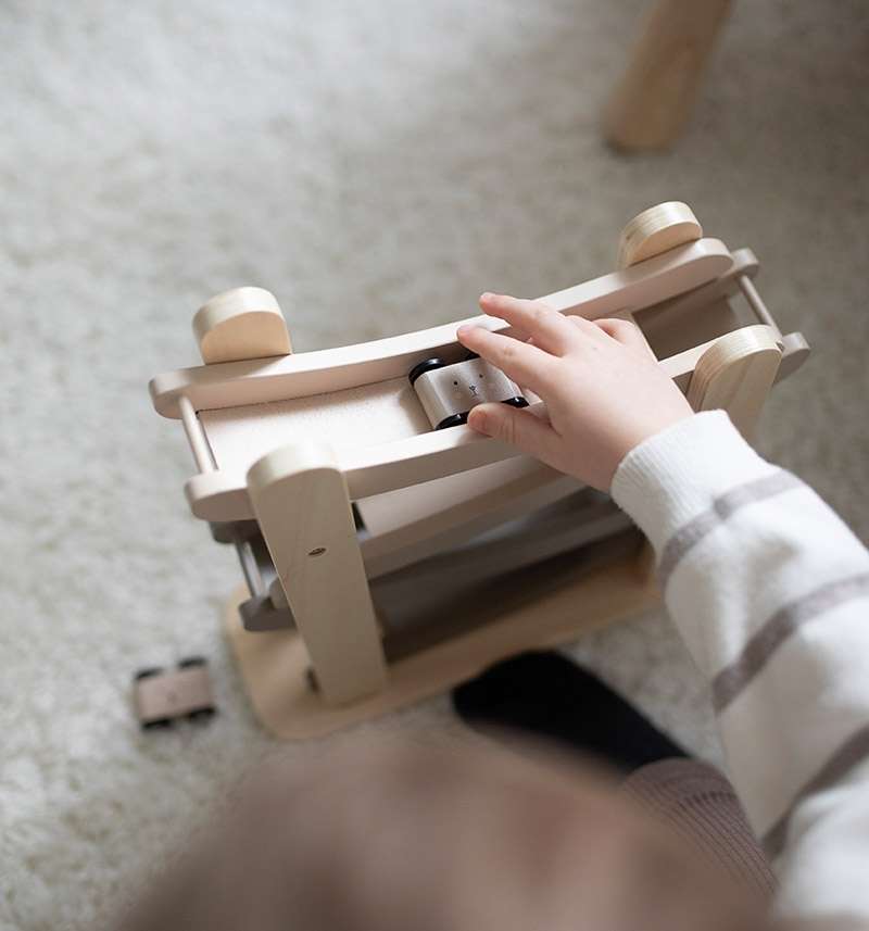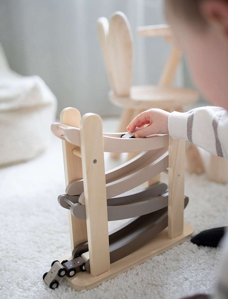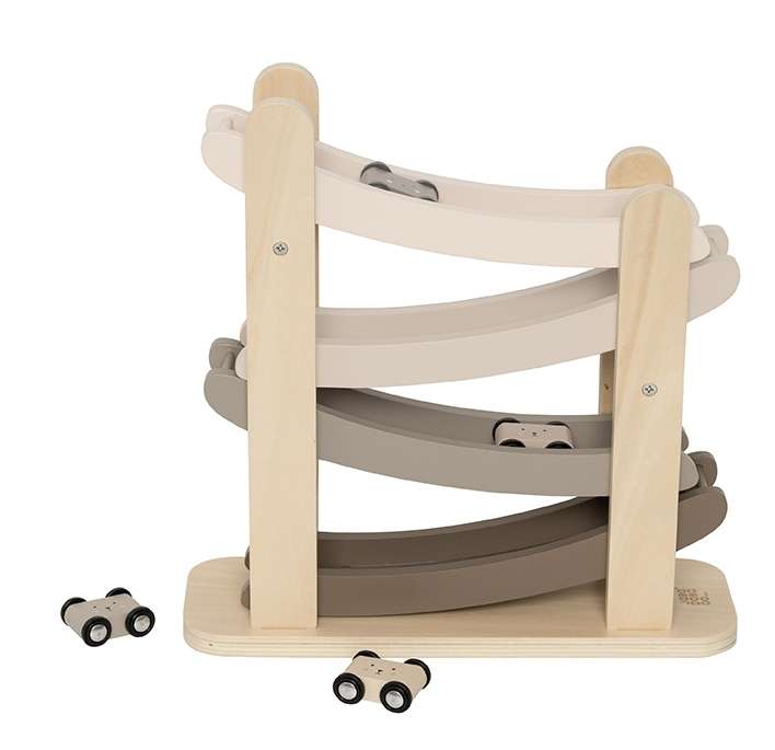 Die Autorutsche in natürlichen Farben ist ein beliebtes kreatives Spiel, das autobegeisterten Kindern viel Spaß macht. Lasse die Autos oben starten und die vier Rampen runtersausen. Fordere deine Freunde heraus, wer hat das schnellste Auto? Ein unterhaltsames Spiel, das Kinder lange beschäftigt.