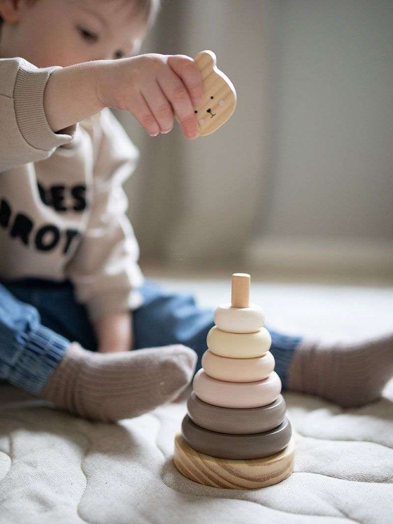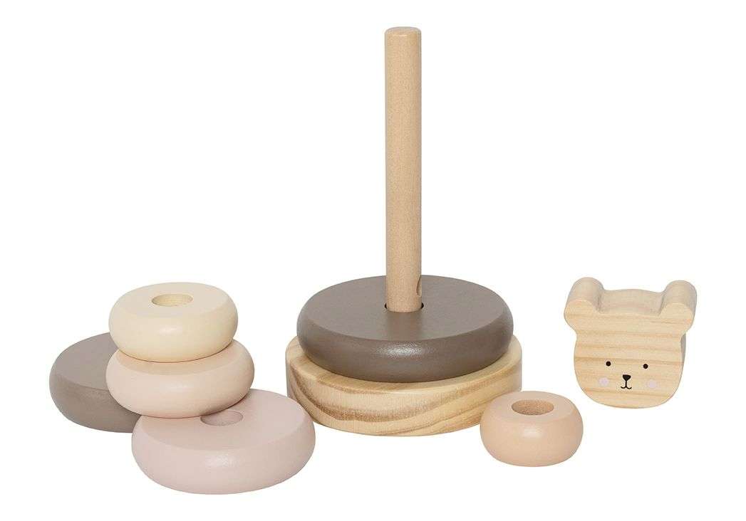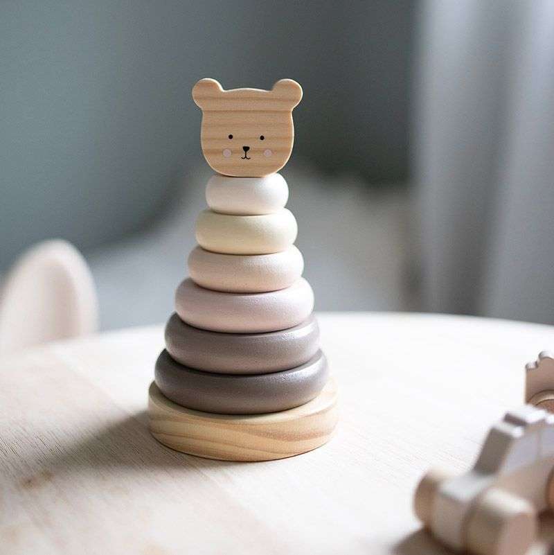 Ein klassisches Holzspielzeug, das jedes Kind haben sollte. Mit der beliebten Teddy-Figur als Kopf oben platziert, werden die Ringe aufeinander gestapelt, wobei dein Kind die Formen und Farben lernt und seine motorischen Fähigkeiten geschult werden. Der Stab in der Mitte ist biegsam für maximale Sicherheit.