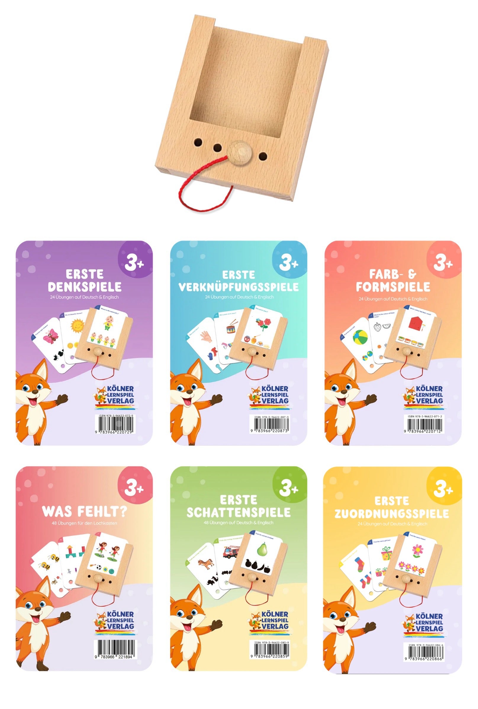 Das Lochkasten Starterpaket ab 3 Jahren bietet ein einzigartiges Lernspiel zur frühkindlichen Entwicklung. Mit dem Lochkasten verknüpfen Kinder Spiel & Spaß und können spielerisch logisches Denken, Sprachverständnis und Konzentration fördern. Die Schwierigkeit der Aufgaben steigt mit der Kartenzahl, was es zu einer spannenden Herausforderung für Kinder macht.