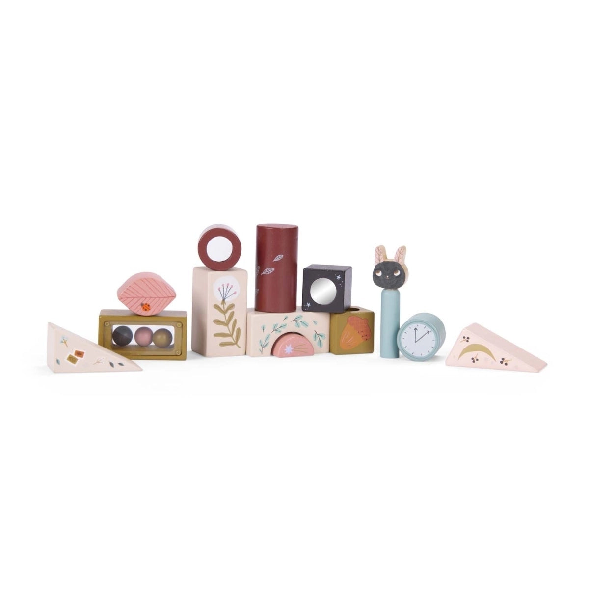 Entdecker-Bausteine aus Holz mit 13 schön illustrierten Teilen. Dank seiner verschiedenen Formen, Kugeln, kleinem Spiegel, Glocke, Pop-up und optischem Prisma fördert dieses Spiel die motorischen Fähigkeiten und bringt Kindern verschiedene Formen und Farben näher.